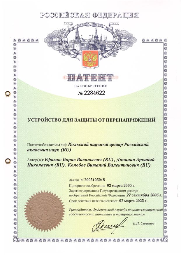 В 2006 году получен патент №2284622 на изобретение «Устройство для защиты от перенапряжений». Патентообладатель – Кольский научный центр Российской академии наук, авторы Ефимов Б.В., Данилин А.Н., Колобов В.В.