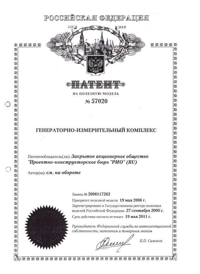 В 2006 году получен патент №257020 на полезную модель «Генераторно-измерительный комплекс». Патентообладатель – Закрытое акционерное общество "Проектно-конструкторское бюро "РИО"", авторы Баранник М.Б., Долбня А.Г., Жамалетдинов А.А., Ефимов Б.В., Катанович А.А., Конторович В.И., Колобов В.В., Кузеванов В.И., Лаврухин В.А., Лисицын Ю.Д., Панфилов А.С., Песин Л.Б., Прокопчук П.И., Фесенко Ю.В., Шевцов А.Н.