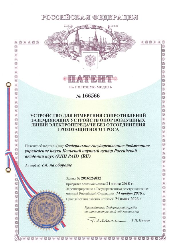 В 2016 году получен патент №166566 на полезную модель «Устройство для измерения сопротивлений заземляющих устройств опор воздушных линий электропередачи без отсоединения грозозащитного троса». Патентообладатель – Федеральное государственное бюджетное учреждение науки Федеральный исследовательский центр «Кольский научный центр Российской академии наук» (КНЦ РАН), авторы Колобов В.В., Селиванов В.Н., Данилин А.Н., Ефимов Б.В., Баранник М.Б.