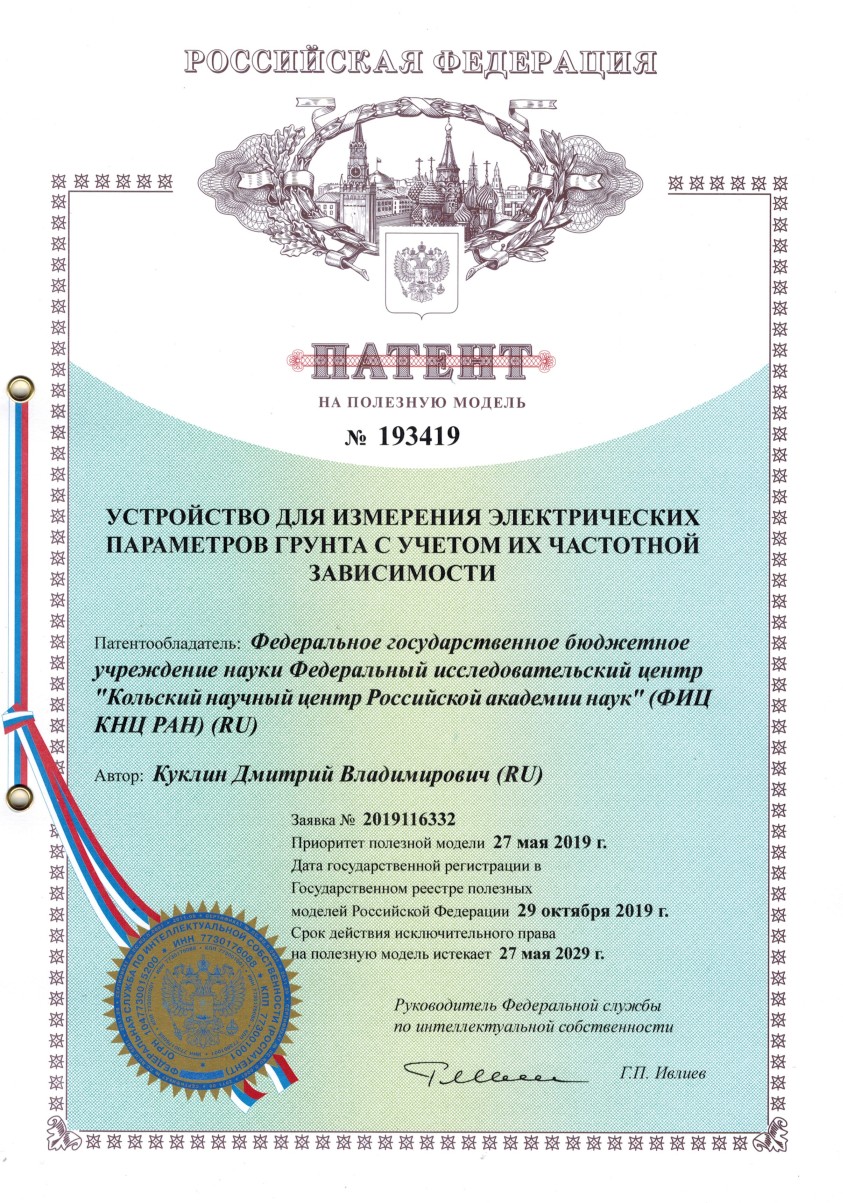 В 2019 году получен патент №193419 на полезную модель «Устройство для измерения электрических параметров грунтов с учетом их частотной зависимости». Патентообладатель – Федеральное государственное бюджетное учреждение науки Кольский научный центр Российской академии наук (КНЦ РАН), автор Куклин Д.В.