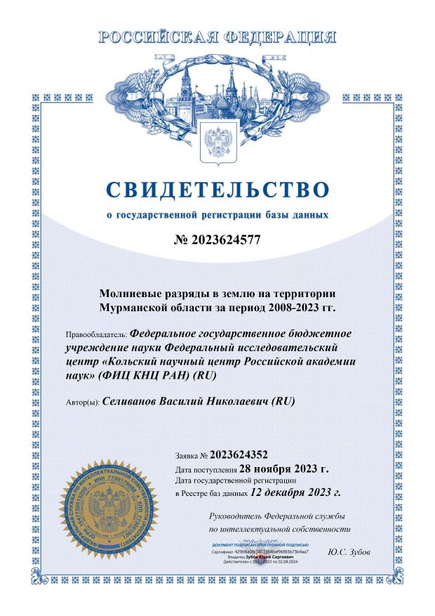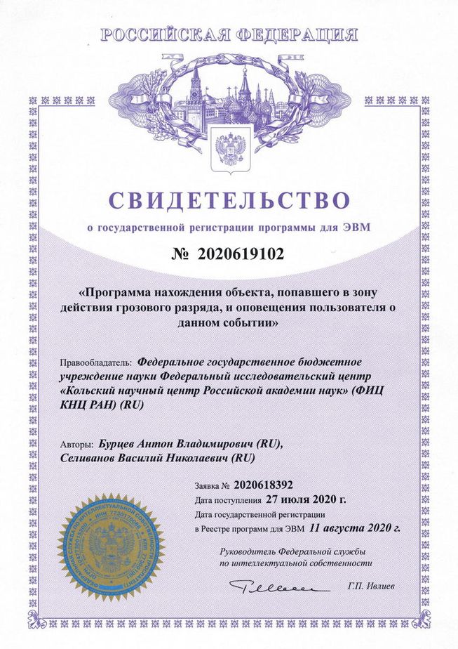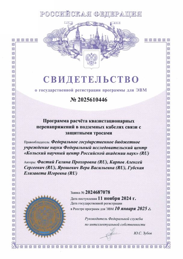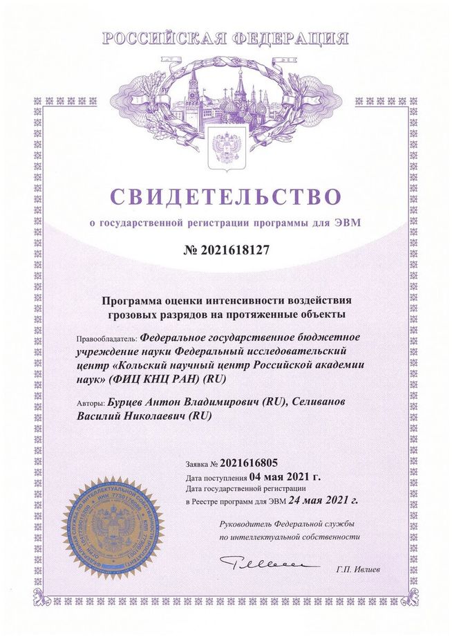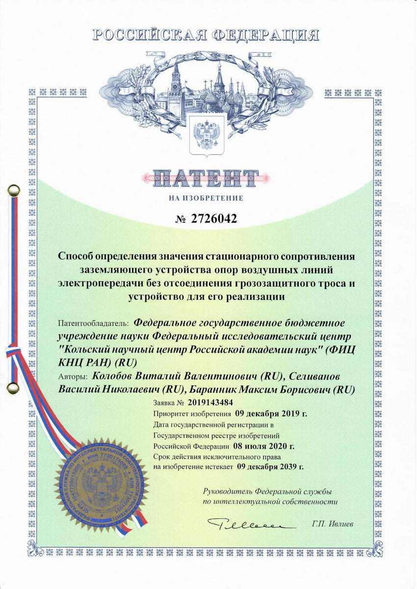 В 2020 году получен патент №2726042 на изобретение «Способ определения значения стационарного сопротивления заземляющего устройства опор воздушных линий электропередачи без отсоединения грозозащитного троса и устройство для его реализации» . Патентообладатель – Федеральное государственное бюджетное учреждение науки Федеральный исследовательский центр «Кольский научный центр Российской академии наук» (ФИЦ КНЦ РАН), авторы Колобов В.В., Селиванов В.Н., Баранник М.Б.