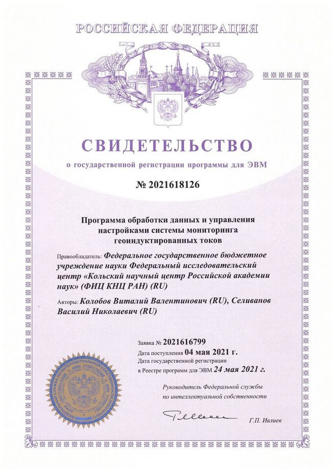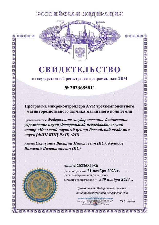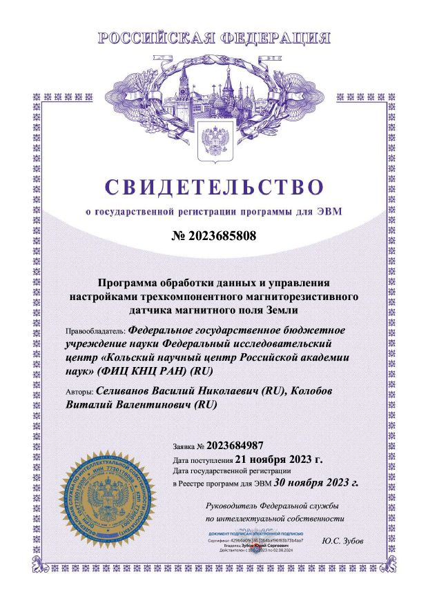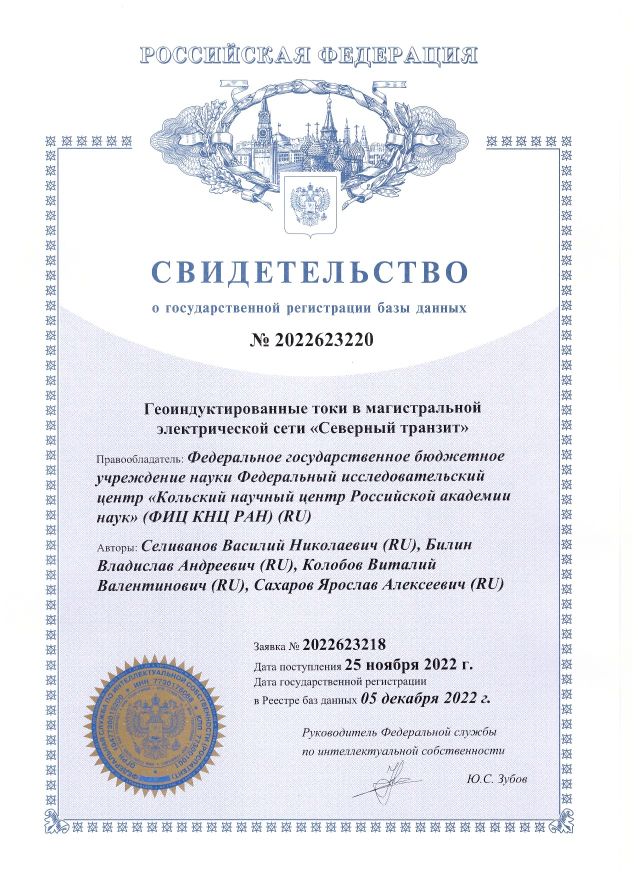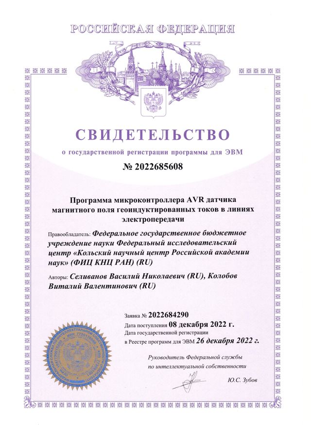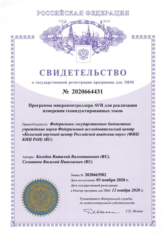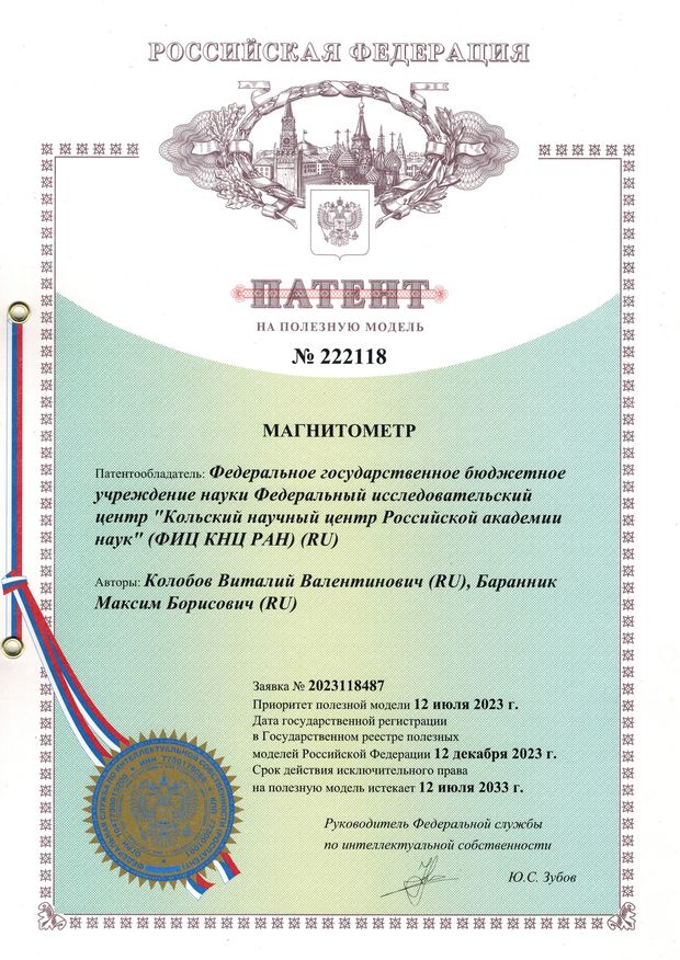 В 2023 году получен патент №222118 на полезную модель «Магнитометр» . Патентообладатель – Федеральное государственное бюджетное учреждение науки Федеральный исследовательский центр «Кольский научный центр Российской академии наук» (ФИЦ КНЦ РАН), авторы Колобов В.В., Баранник М.Б.