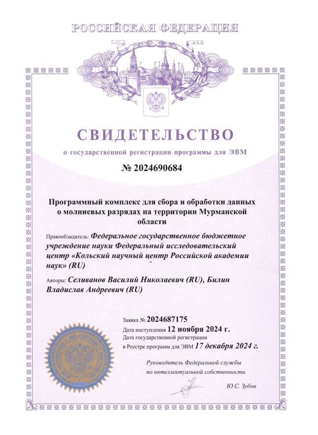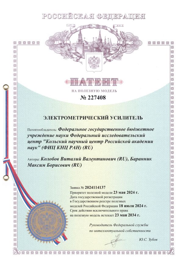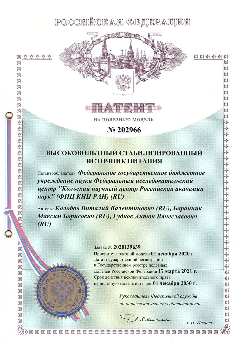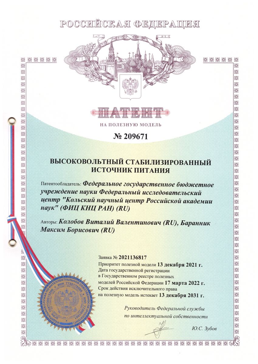 В 2021 году получен патент №202966 на полезную модель «Высоковольтный стабилизированный источник питания». Патентообладатель – Федеральное государственное бюджетное учреждение науки Федеральный исследовательский центр «Кольский научный центр Российской академии наук» (ФИЦ КНЦ РАН), авторы Колобов В.В., Баранник М.Б., Гудков А.В.