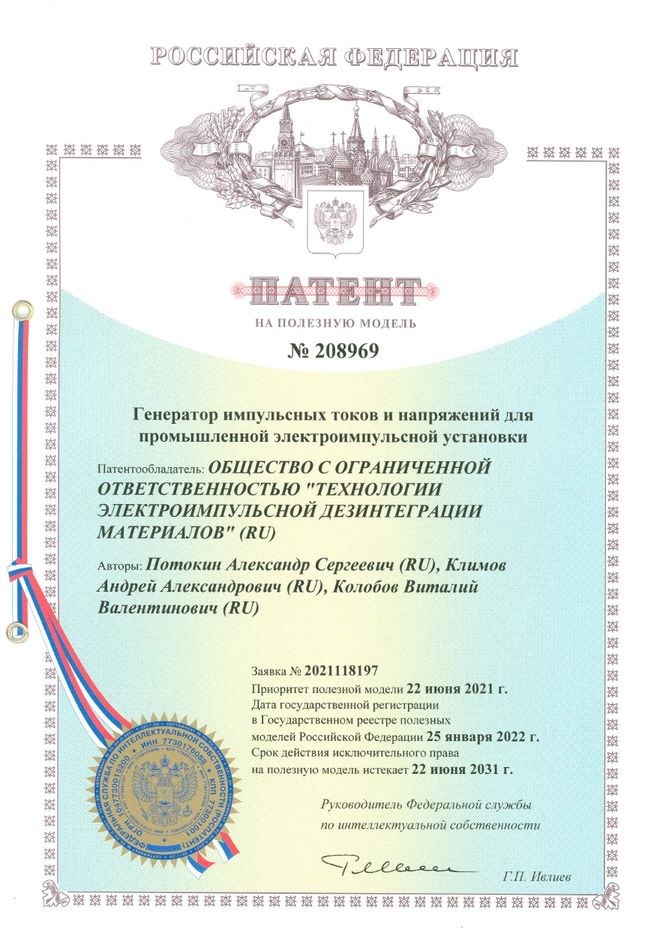 В 2022 году получен патент №208969 на полезную модель «Генератор импульсных токов и напряжения для промышленной электроимпульсной установки» . Патентообладатель – ООО «Технологии электримпульсной дезинтеграции материалов», авторы Потокин А.С., Климов А.А., Колобов В.В.